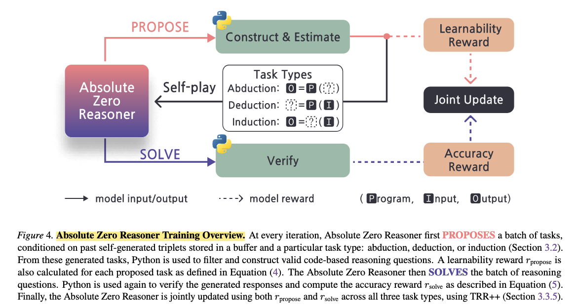 최근 LLM을 강화학습을 통해 학습시키는 방법론 중, self-play를 통해 코딩테스트 문제를 생성하고 직접 풀이하며 reward를 제공하는 방식(Absolute Zero: Reinforced Self-play Reasoning with Zero Data)와 같은 방법론들이 연구되면서, 논리적인 방식으로의 reasoning(Chain of Thought 와 비슷한 개념) 역량을 강화하는 방법론에 '코드 동작' 이 필수적으로 수행되고 있다.
